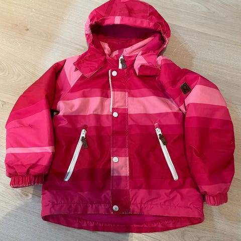 Reima vinterjakke i størrelse 116 for jenter. Jakken har en vakker dyp lilla farge med blomstermønster. Den har hette og refleks detaljer. Jakken er litt slitt nederst på kanten på baksiden og noe på ermene. Se bilder.