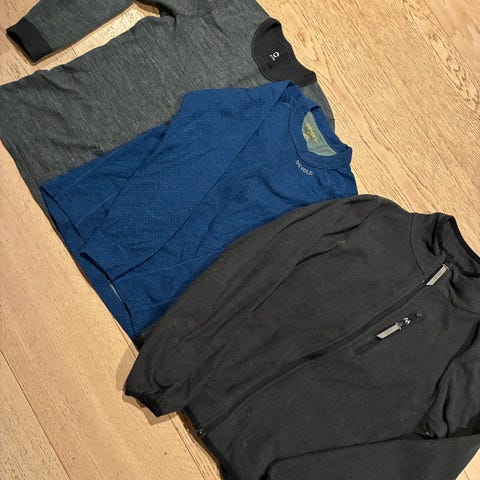 3 tynnull stilongs / bukser og en fleece jakke / genser. Vikafjell fleecejakke str 12, Safa tynnullbukse str 150, Lindex tynnullbukse 146/152 ( 10-12 år), Varde tynnullbukse str 10 år. Størrelsene er omtrent like, brukt i samme sesong av et barn.