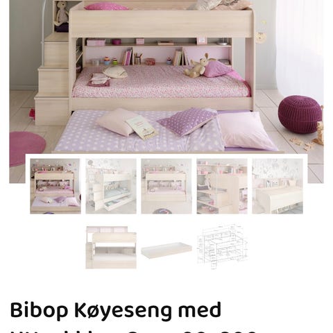 Hvitbeiset Grindberg køyeseng i heltre furu selges. Det følger med sengebunner, stige og sengehest. Madrassmål 75 cm x 200 cm. Utvendige mål H 158 cm, L 207 cm og dybde 84 cm. Senga har vært brukt som gjesteseng og er pent brukt. Solid og fin. Kun noen få ubetydelige bruksmerker. Hentes på Eigerøy i Egersund.