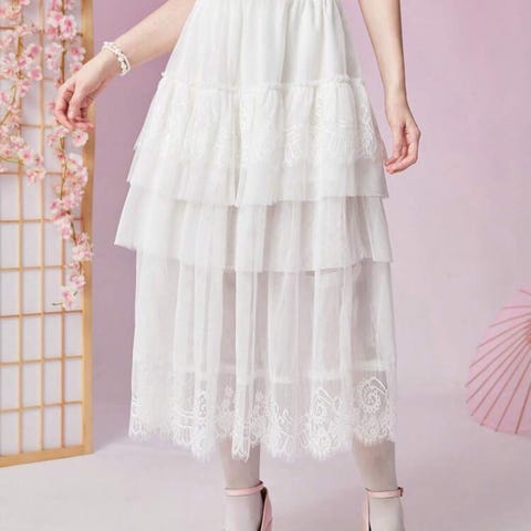 Hvit kjole i størrelse M/L for damer. Kjolen har kort erme og glidelås bak. Materialet fremstår som glatt og strukturert.