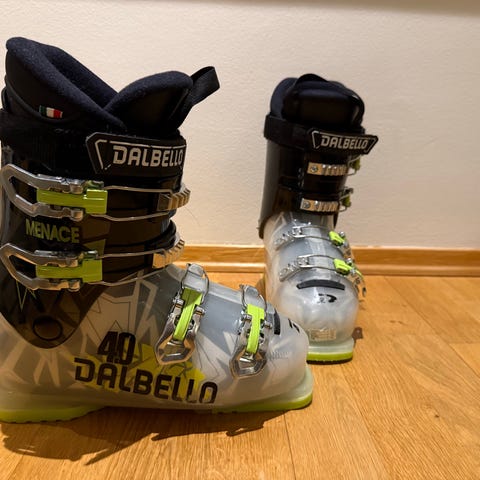 Dalbello ski-støvler i størrelse 40. Fargen er svart med enkelte grå detaljer. Støvlene har fire spenner for justering og god passform. Sålen har mønster for grep. Passer for voksne med små føtter.