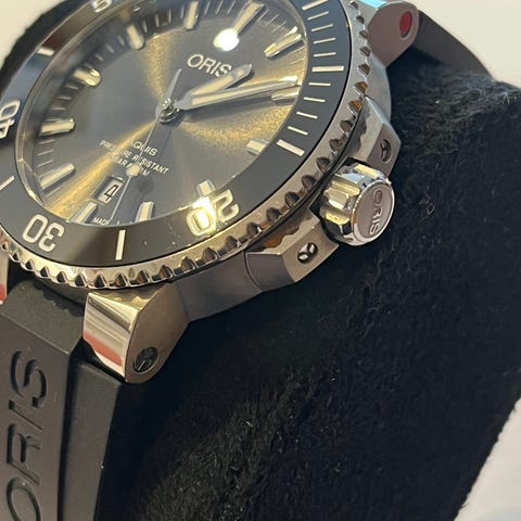 Selger en pen Oris Aquis Date med den populære grå skiven – en modell som kombinerer sporty funksjonalitet med et stilrent uttrykk. Perfekt både til hverdags og mer formelle anledninger.