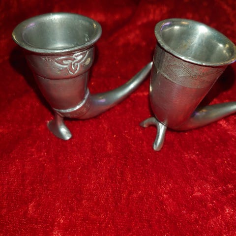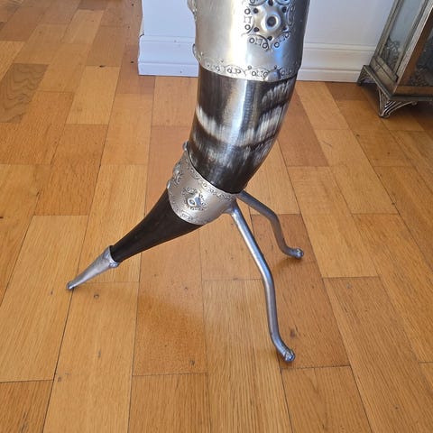 Drikkebeger laget av dyrehorn med dekorative tinnbeslag selges. Dette er av ekte dyrehorn med hånddekorert tinnarbeid fra Tokketinn. Sannsynlig fra 50-60 tallet.