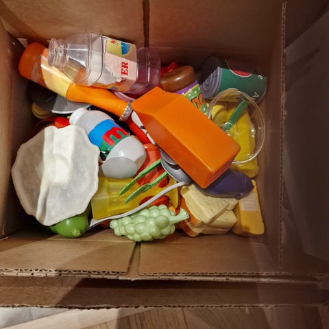 Selger lekemat og kjøkkenleker bestående av ulike matvarer og kjøkkenredskaper i forskjellige farger og former. Egnet for barn til lek og rollelek.