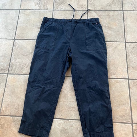 Behagelig smalstripet cordfløyelsbukse med god stretch fra Tommy Hilfiger. Modell Tribecka Straight Ankle. 98% bomull og 2 % elestan. Størrelsen som står på lappen er 12. Dette skal tilsvare XXL og EU str.44 i følge nettsiden https://uk.tommy.com/womens-size-guide