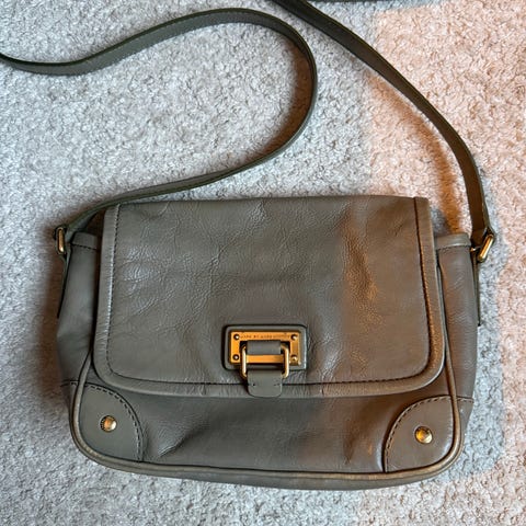 Marc Jacobs skulderveske laget av lær. Vesken har en skulderrem og flere lommer, inkludert to frontlommer med turnlock og en glidelåslomme på innsiden. Innvendig fôr med Marc Jacobs-logo. Vesken har en enkel og funksjonell utforming, veldig pent brukt - har et lite bruksmerke foran, se bilde. Vakre messingdetaljer på knapper, rem og glidelås