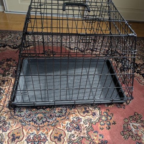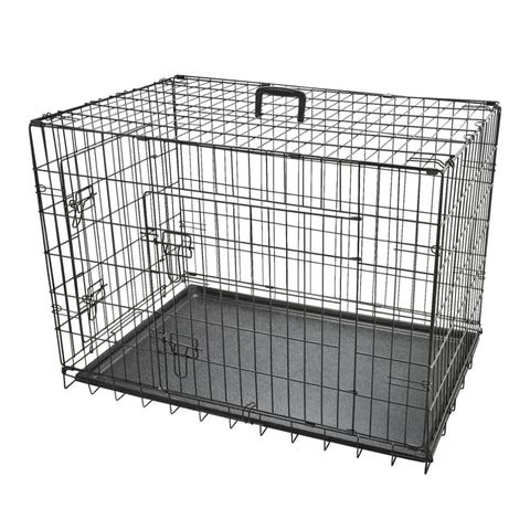 Hundebur laget av metall med en avtakbar plastbunn. Buret har to dører for enkel tilgang og sikkerhet. Passer til transport eller oppbevaring av hunder.