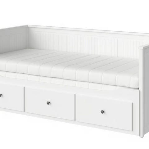 IKEA sovesofa med tre oppbevaringsskuffer under soveflaten. Sofaen har en hvit farge og er laget av tre.