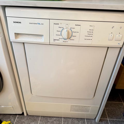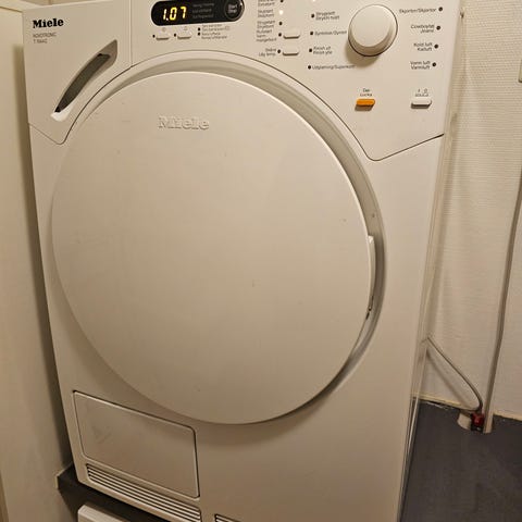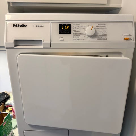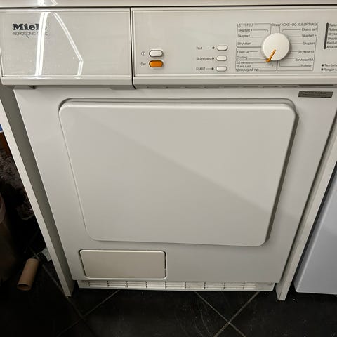 Miele T233C kondenstørketrommel. Kvalitietsmaskin som er produsert i Tyskland. Modellen har en kapasitet på 5 kg og er utstyrt med flere tørkeprogrammer. Har egen avløpsslange slik at man ikke behøver å benytte og tømme vannbeholderen. Har til i dag vært i daglig bruk, men byttes nå ut med en nyere maskin med varmepumpe. Skifte av drivreim og strammehjul kan vurderes på sikt.