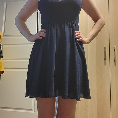 Floyd festkjole i blå chiffon, størrelse XS. Kjolen har en dyp V-utringning og er laget i lett chiffon materiale. Det er også en V- formet rygg. Passer til formelle anledninger og festbruk.
