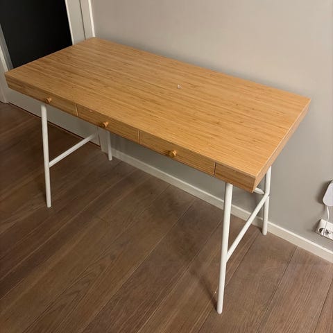 Et pent skrivebord laget av slitesterk bambus. Ser bra ut fra alle vinkler, slik at du kan i plassere det midt i rommet hvis det passer deg best. Tre skuffer i A4-størrelse til oppbevaring av papir og andre mindre ting.