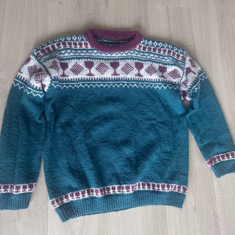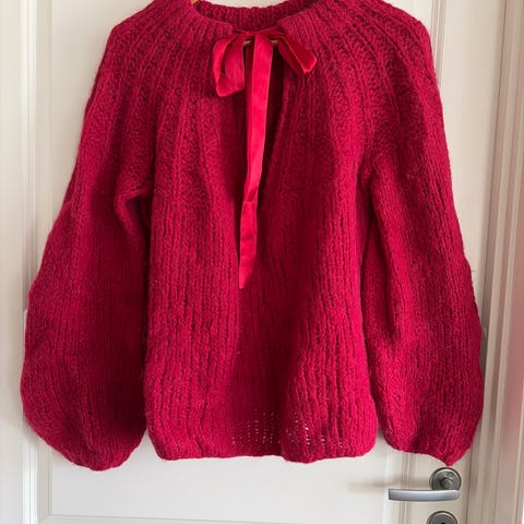 Hjemmestrikket ullgenser, burgunderrød og gråbeige (carmen genser). Strikket i Alpaca picasso tweed fra viking garn. Str L. Kun brukt ett par timer. 600 kr (garnpris).