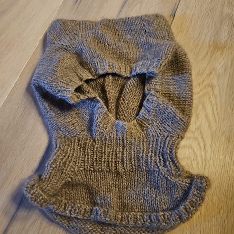 Strikket i merinoull og mohair. Fleksibel i størrelsen, men vi brukte den fra 2-5 år