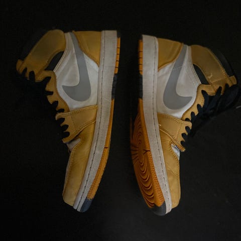 Air Jordan Sneakers joggesko i størrelse 39. Skoene har en kombinasjon av hvit, gul og svart farge.
