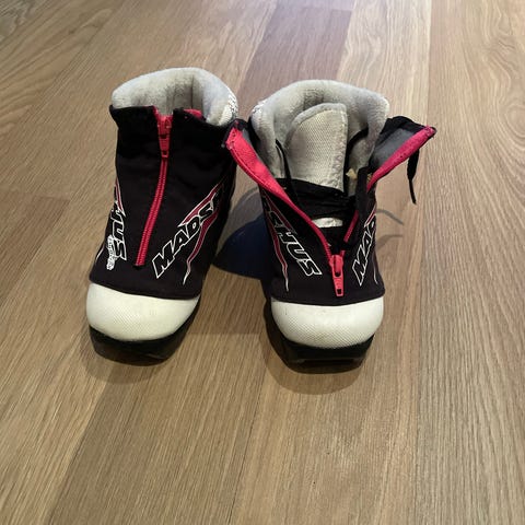Madshus Butterfly langrennsko i størrelse 33. Skiene har svart, hvit og rød fargekombinasjon og er utstyrt med solide såler for feste og glid. Passer for barn eller små føtter.