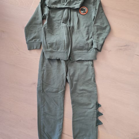 Pent brukt joggedress str 110/116. Er noen flekker på buksen ( se bilder) kan være kjøper får det av i vask. Ellers ingen feil eller mangler.