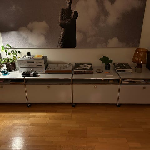 Dyp Usm haller skjenk med lagring. Selger som godt brukt fordi det er en del riper i topplata, men ellers er den veldig fin, og fungerer som den skal. Skjenken kommer med totalt 4 metallkurver med hjul som kan trekkes ut. Den består av både 1. og 2. generasjons deler. Skjenken er ganske tung
