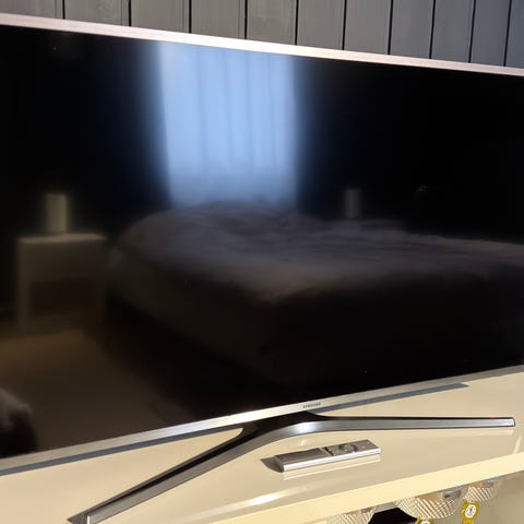 Samsung TV med flatskjermdesign. Passer for visning av video- og TV-innhold i hjemmet eller kontormiljø.