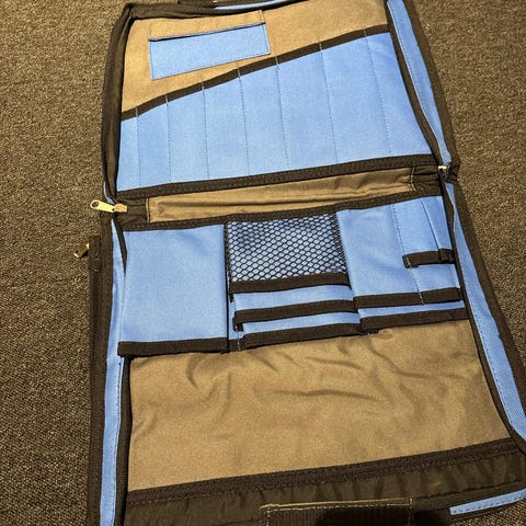 Helt ny - ubrukt, men har ikke lapp. Sammenlagt mappe er 36 x 30 cm. Helt utslått er den 117 cm. Solid stoff/ materiale i mappa. Mulig det heter bevernylon.