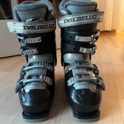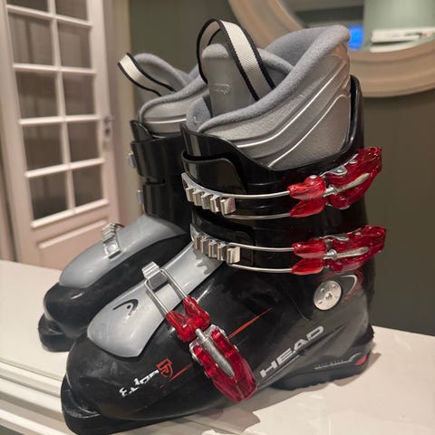 Head alpinstøvler i størrelse mondo 230-235. Støvlene er svart med hvite og neon gule detaljer. Utstyrt med tre spenner for justering og god passform.
