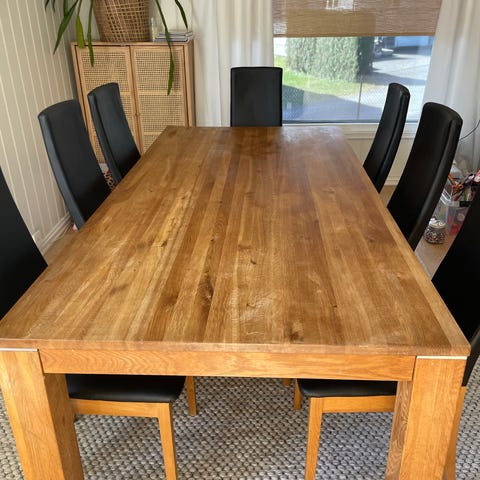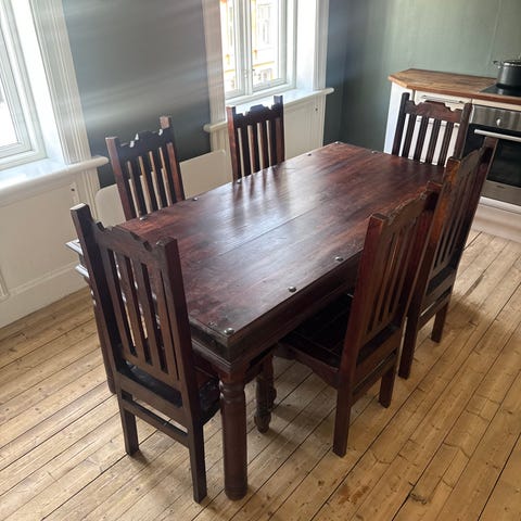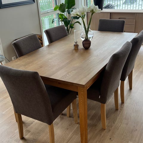 Bord og stoler er kjøpt på Møbelringen for ca 12 år siden. Tunge og solide møbler av eik. Slitt bordplate som kan enkelt gjøre noe med. Følger med en ileggsplate som festes på en av endene.