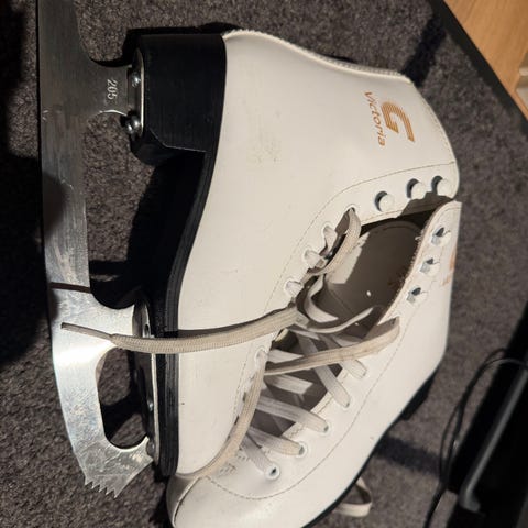 Barneskøyter for ishockey i størrelse 31-34 med hvit og lilla farge. Skøytene har justerbare stropper og er egnet for barn som vil gå på skøyter