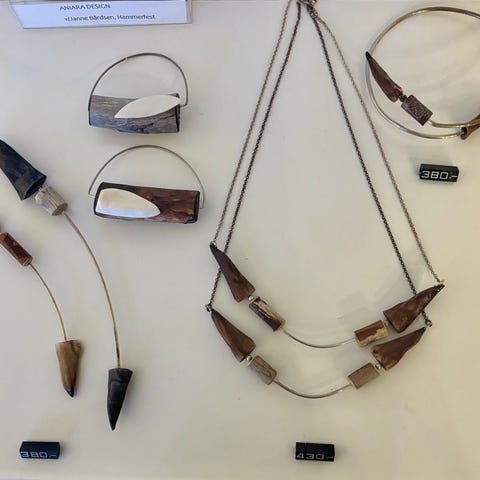 Thulitt er betegnet som Norges nasjonalstein. Her et stykke smykkedesign av Skai design fra ca år 2000. øredobber laget av thulitt og sølv. 925 S.