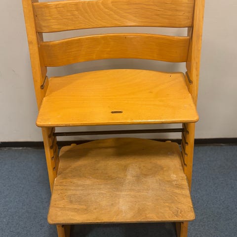 Stokke tripp trapp stol laget i tre. Designet for barn og gir støtte med ryggstøtte og sikkerhetsstang. Justerbar sitte- og fotplate for tilpasning til barnets størrelse.