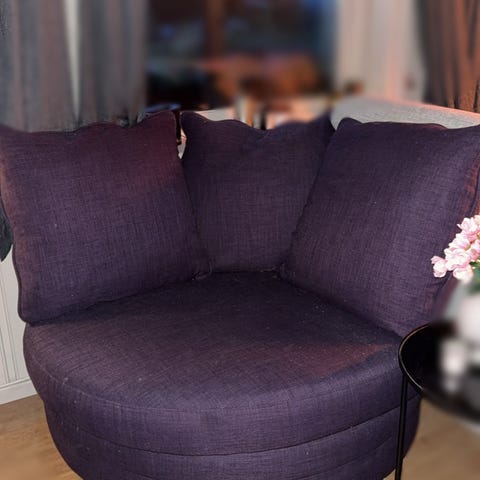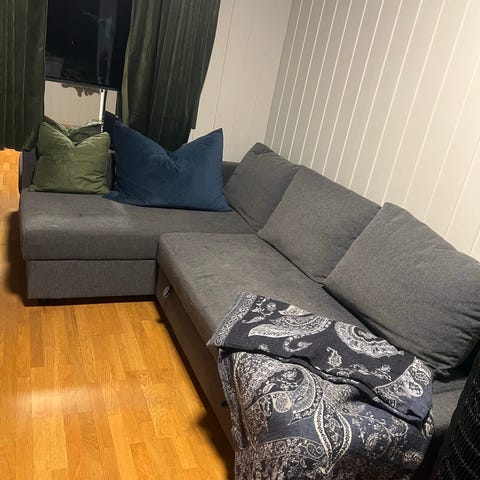 Selger en lite brukt brukt 2-seter sofa i grå tekstil. Vendbare puter