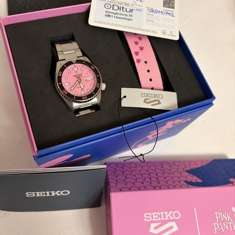 Denne limited edition-klokken er det første samarbeidet mellom Seiko 5 Sports og den ikoniske tegneseriefiguren Pink Panther. Designet er inspirert av episoden “The Pink Phink.” I en klassisk SKX-stil fra 1990 får du en klokke med knallrosa skive, svart bezel med rosa tall og et valg mellom lenke eller matchende nylonrem med teksten WET PAINT – en direkte referanse til episodens kjente malingsspøk. Skiven har fotavtrykk, og gjennom den åpne baklokket ser man Pantherens øyne bak rosa maling. Kronen har en rosa "diamant" som hyller den berømte Pink Panther-edelstenen. Klokken leveres i en lekent husformet blå/rosa eske inspirert av episodens miljø, pyntet med Pink Panther og Inspector Clouseau. Seiko 5 Sports står for over 50 år med pålitelighet og kvalitet. «5» viser til kjennetegnene som fortsatt gjelder: automatikk, dag-dato, vanntetthet, innfelt krone og slitesterkt ur og lenke.