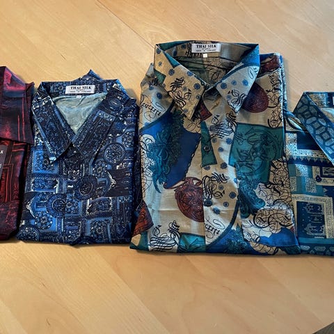 Har også 2 andre silkeskjorter fra Vietnam rustfarget og svart/brunmønstret 300,- pr stk