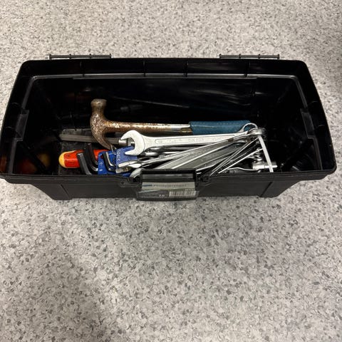 Et utvalg av diverse verktøy og tilbehør inkludert patentbånd, målebånd, skrutrekkere, koblinger, elektriske komponenter og annet småutstyr. Produktene varierer i type og funksjon, egnet for ulike reparasjons- og vedlikeholdsoppgaver.