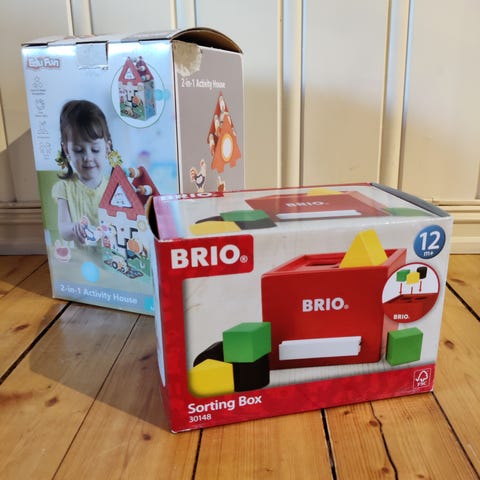 Puttekasse i tre, og en aktivitetsleder med xylofon. Meget pent brukt og klar for nye små hender