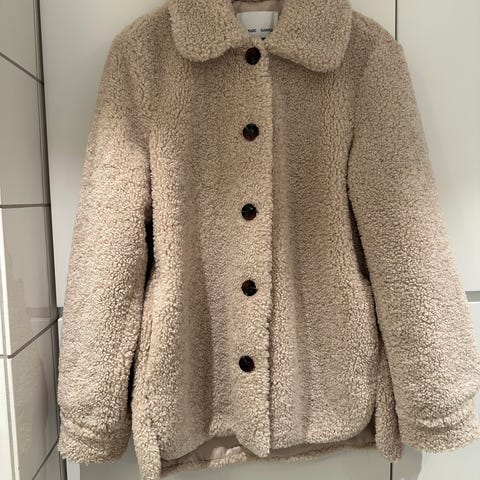 Fuskepels / faux fur fra Samsøe Samsøe. Stikklommer, liten splitt i siden, fine brune kontrastknapper. Fôret. Fin beige farge. I veldig gid stand. Str M.