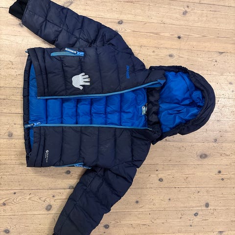 Dunjakke i str 116. Godt brukt av to barn. Mangler hette. Har litt misfarging i glidelås (se bilde). Nyvasket og tørketromlet med tennisballer. Vasket med vaskemiddel beregnet på dunjakker.