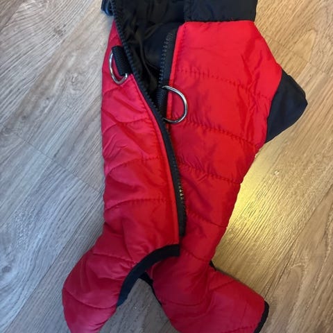 Rød boble dress foret tilliten hund . Rygglengde 23cm . Ikke brukt fordi jeg måtte kjøpe større str . Varm og fin nå om dagen
