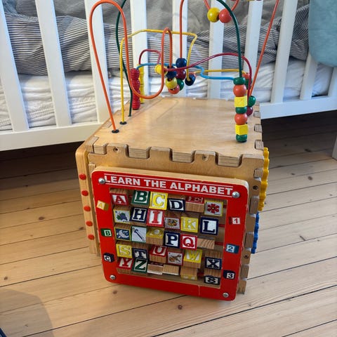 Aktivitetskube i tre med fargerike figurer som inkluderer klosser, tall, former og tannhjul. Leketøyet har ulike aktiviteter som fremmer motorikk. Kuben har vanlige bruksslitasjer, men er hel og fin og fungerer som den skal.