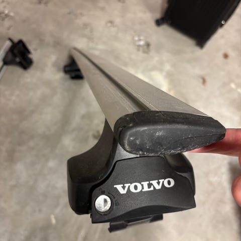 Volvo takstativ i aluminium med plastdeler. Passer for montering på tak av bil for transport av ski/ekstra last. Stativet er utstyrt med festemekanismer i plast og metall.