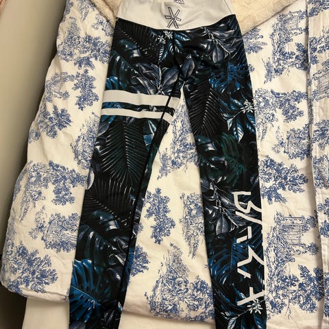 BARA Sportswear treningstights for dame i størrelse S. Tightsen har et mønstret design med blå og svarte farger. Materialet består av 73 % polyester og 27 % spandex, egnet for fitnessaktiviteter.