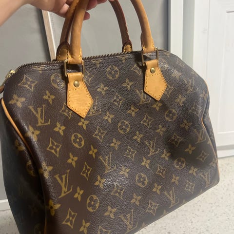 Selges en speedy bandoulier i str 25. Louis Vuitton dameveske i lær med karakteristisk monogrammønster. Vesken har to håndtak og en avtakbar skulderrem i lær med gullfargede metallfester. Designet for damebruk.