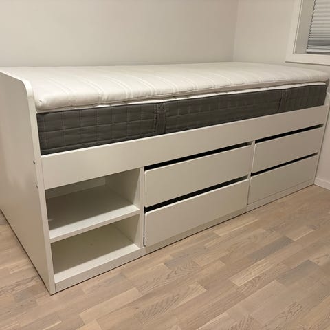 IKEA Flekke seng med hvit ramme, inkludert oppbevaringsskuffer under sengen og en uttrekkbar ekstra seng, slik at den kan bli 160cm. Sengen har lamellbunn. Passer til barnerom eller gjesterom der ekstra soveplass og lagringsmuligheter er ønsket.