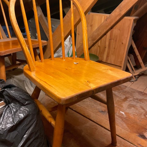 Gammel trestol selges. Se bilde for en liten skade, som nok er enkel å fikse med rett utstyr og litt tålmodighet 😊