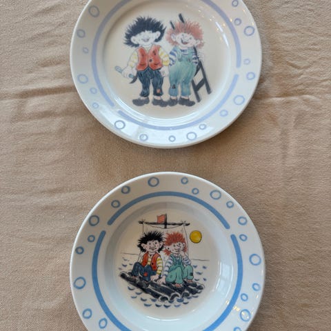 Tallerkenene har fargerike illustrasjoner med ulike figurer og scener fra kardemomme by, laget i porselen.
