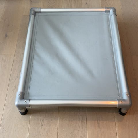 Katz Kattehylle i grått stoff med metallramme. Designet som en hevet seng eller hylle for hunder, gir et komfortabelt og solid hvilested.
