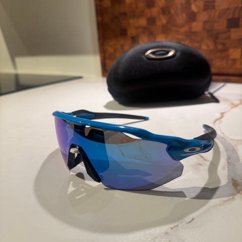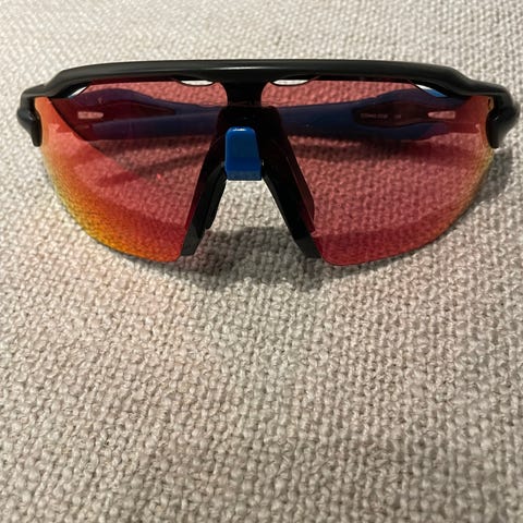 Oakley sportsbriller for herre med sort og hvit innfatning og mørke glass. Med etui. Brillene har et lite merke på høyre side av glasset, men synes lite og er ikke sjenerende ved bruk, se bilde.