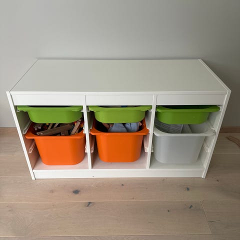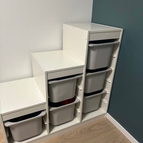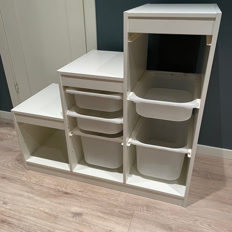 IKEA Trofast oppbevaringsmøbel med seks skuffer i hvit farge. Passer til organisering av leker eller annet småutstyr. Laget for barnerom eller andre oppbevaringsbehov.