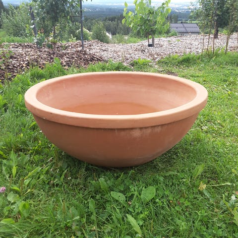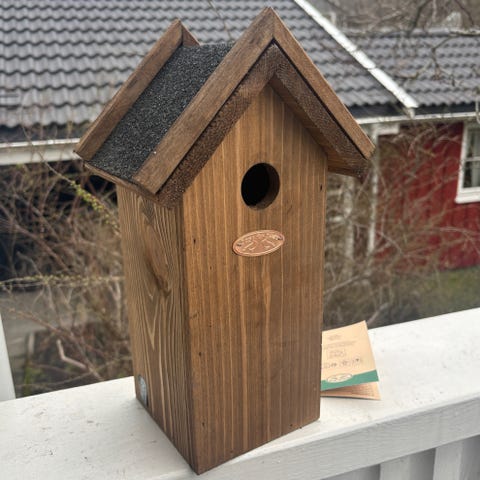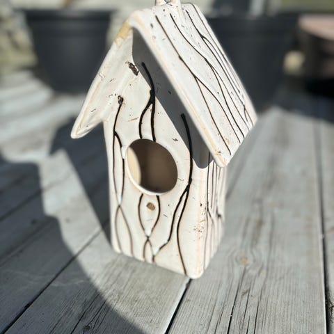 Fuglehus med vakker brun-hvit glasur og naturlig jutetråd til oppheng. Kan brukes både som dekor innendørs eller utendørs (for småfugler).