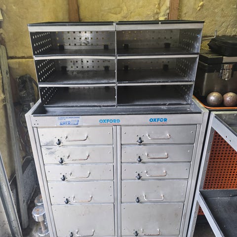 Selger en reol fra kjent kvalitets merke Forch varo. Stødig. Ble brukt tidligere til utstyr av dekk. Perfekt for å ha oversikt over muttere og skruer👍