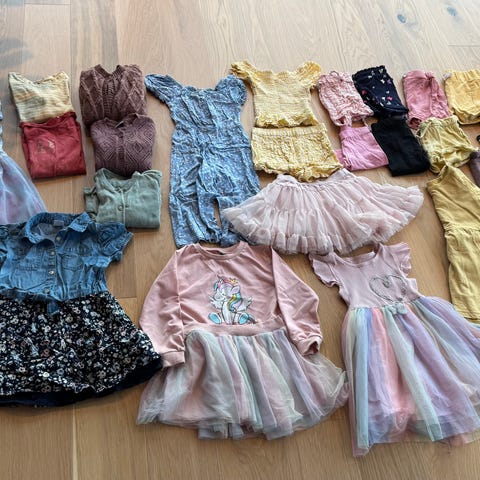 Selger klespakke for jente – str. 92–98 (2–3 år) – ca. 25 plagg – 100 kr
