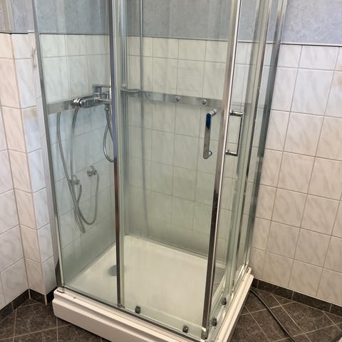 Selger en dusjkabinett, en av glassrutene er knust. Gis bort mot demontering